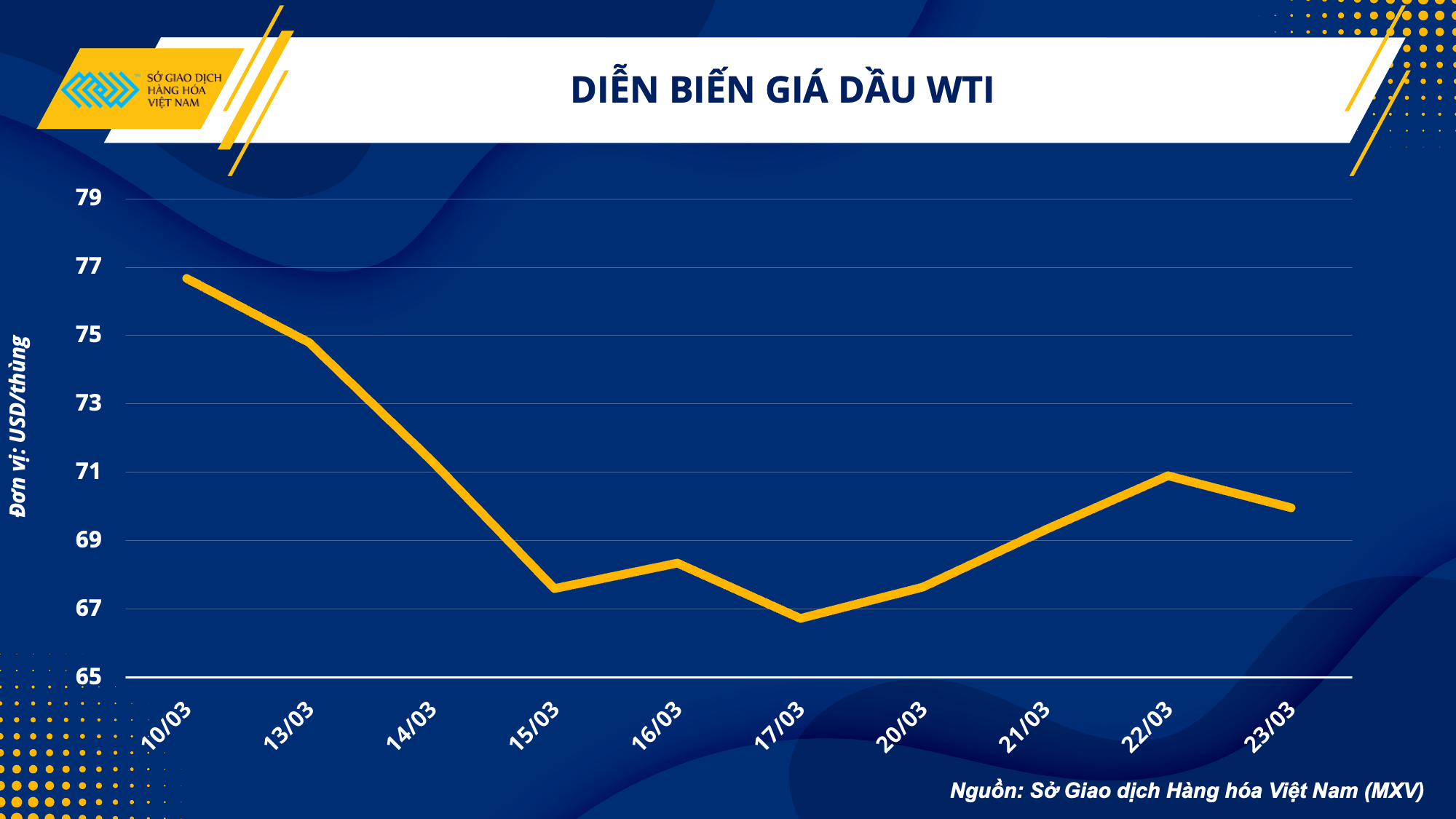 Dầu thô đã ghi nhận một phiên với diễn biến khó lường, khi tăng trong hơn nửa đầu phiên, nhưng sau đó đảo chiều giảm trở lại và kết thúc trong sắc đỏ. Kết phiên ngày 23/03, giá dầu WTI giảm 1,33% xuống 69,96 USD/thùng, dầu Brent giảm 1,15% xuống 75,5 USD/thùng.