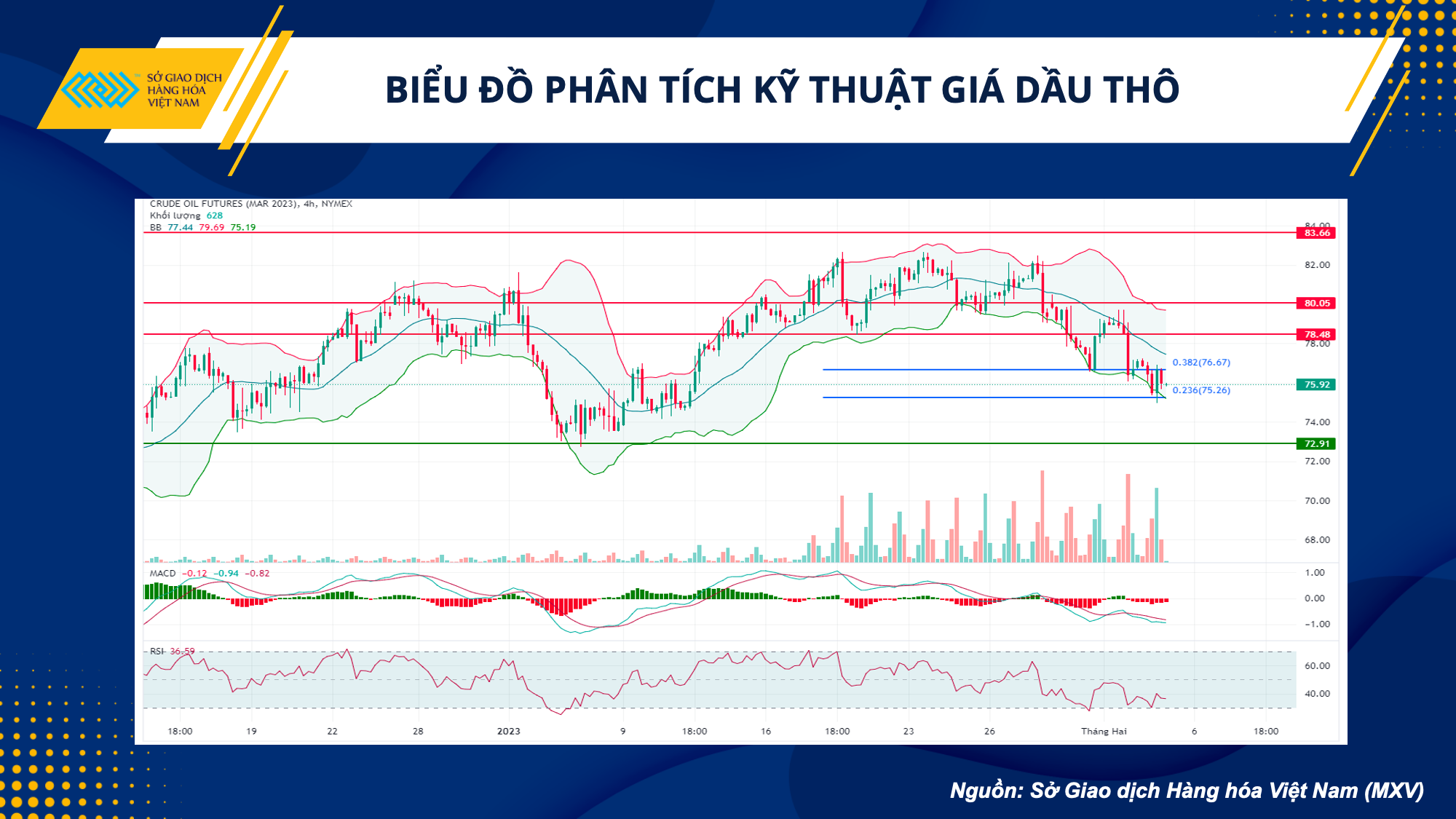 Về mặt kỹ thuật, giá dầu đang giằng co giữa hai mốc Fibonacci 23,6 và 38,2 điểm, tương đương biên độ 75 – 76,5 USD. Giá duy trì giao dịch ở nửa dưới của Bollinger Band, cùng các chỉ số MACD và RSI cho thấy sức bán vẫn áp đảo, Nhà đầu tư có thể đợi giá hồi lên khu vực cạnh giữa, và canh bán ở mức 77,4 USD với kỳ vọng chốt lời ở mức 76,4 USD.