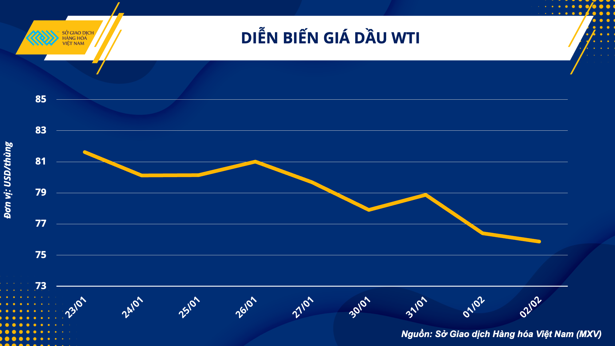 Sắc đỏ tiếp tục được duy trì trên thị trường dầu thô khi phiên giao dịch ngày 02/02 kết thúc. Giá dầu thô WTI giảm 0,69% về 75,88 USD/thùng, và giá dầu thô Brent giảm 0,89% về 82,10 USD/thùng.