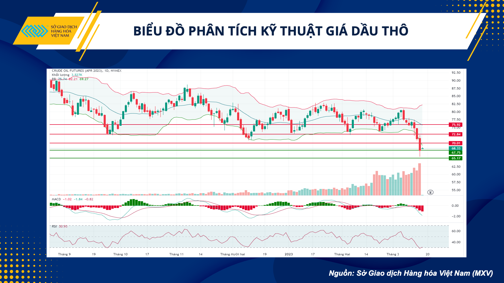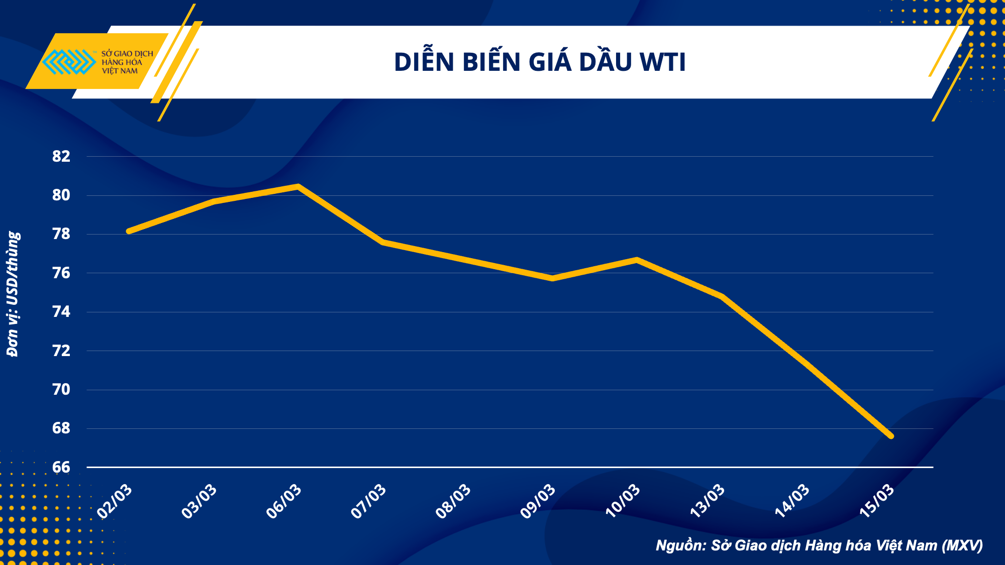 Giá dầu lao dốc về mức thấp nhất kể từ tháng 12/2021 trong bối cảnh nhà đầu tư đón nhận hàng loạt các tin tức tiêu cực từ cả yếu tố vĩ mô và bức tranh cung cầu. Kết thúc phiên 15/03, giá dầu thô WTI giảm 5,22% về 67,61 USD/thùng, giá dầu thô Brent giảm 4,85% về 73,69 USD thùng.