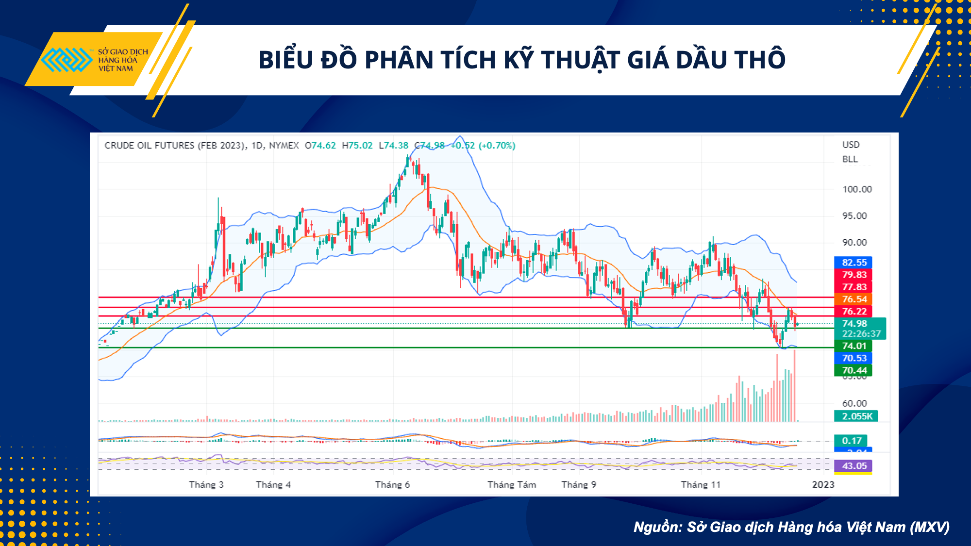 Về mặt kỹ thuật, giá dầu đang tiếp tục di chuyển dưới cạnh giữa dải Bollinger Band khung Daily. MACS và RSI đang có xu hướng hướng lên. Nhiều khả năng giá sẽ quay lại cạnh giữa của dải. Các nhà đầu tư có thể mở vị thế mua tại 75 USD/thùng với kỳ vọng chốt lời 76,2 USD/thùng. Cắt lỗ tại 74,3 USD/thùng.