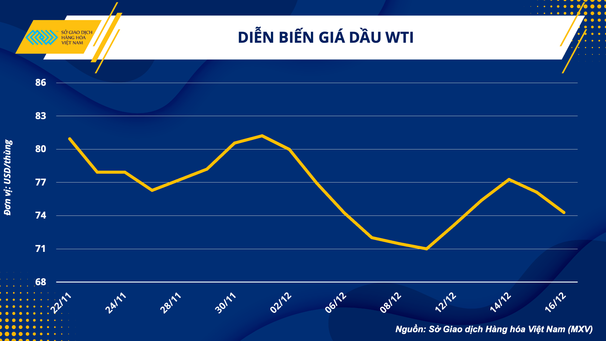 Kết thúc tuần giao dịch 12/12 – 18/12, sắc xanh bao phủ toàn bộ các mặt hàng trong nhóm năng lượng. Dầu thô đã trải qua một tuần với những biến động mạnh mẽ từ cả yếu tố cung cầu và yếu tố vĩ mô. Giá dầu WTI chốt tuần ở mức 74,29 USD/thùng sau khi tăng 4,6% so với tuần trước, giá dầu Brent tăng 3,86% lên mức 79,04 USD/thùng.