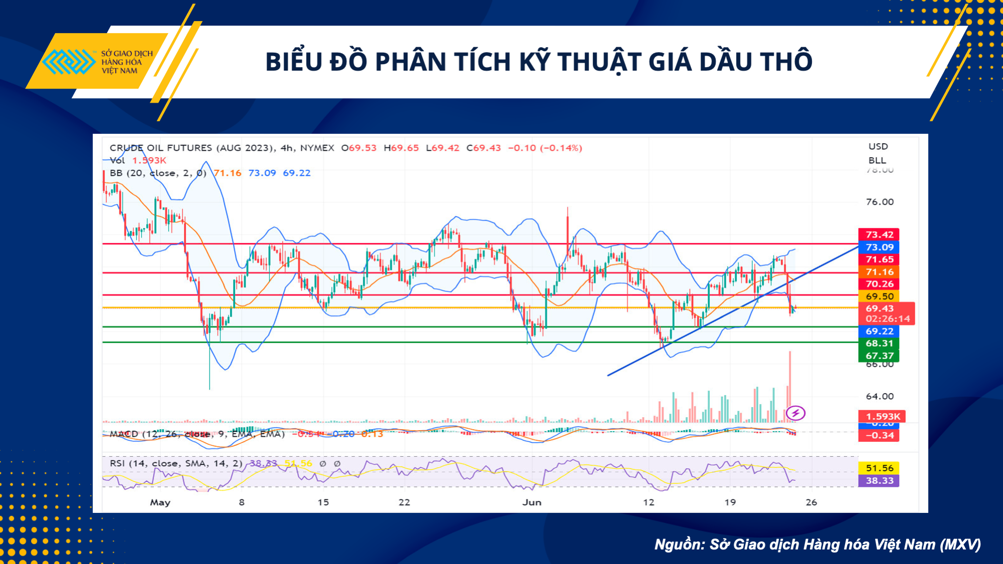 Về mặt kỹ thuật, giá dầu phá vỡ kênh xu hướng tăng ngắn hạn và vùng hỗ trợ 70 USD. Điều này nhiều khả năng sẽ tiếp tục đẩy giá dầu về vùng 68 USD. Giá dầu có thể sẽ giằng co quanh vùng hỗ trợ 69,5 USD trước khi nối tiếp đà giảm, nhưng cũng có kịch bản sẽ hồi về vùng 70 USD và giảm trở lại. Chúng tôi thiên về kịch bản 1 nhiều hơn, do thị trường thiếu vắng các thông tin cơ bản đủ mạnh để hỗ trợ giá. Các nhà đầu tư có thể mở bán tại 69,5 USD với kỳ vọng chốt lời tại 68,3 USD.