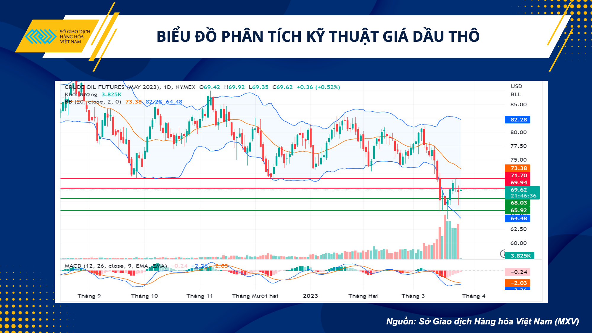 Khối lượng giao dịch cho thấy lực bán đang có phần mạnh lên, nhưng giá dầu đang ở vùng khá quan trọng. Vùng 70 – 70,3 USD sẽ là mốc mà giá dầu cần phải vượt qua để có thể thiết lập đà tăng mạnh. Trong trường hợp giá dầu phá được vùng này, nhà đầu tư có thể mở mua và kỳ vọng chốt lời 71,8 USD. Tuy nhiên, trong trường hợp thiếu vắng thông tin cơ bản hỗ trợ giá và khiến giá trở về vùng 69 USD, có thể mở bán với kỳ vọng chốt lời tại 68 USD.