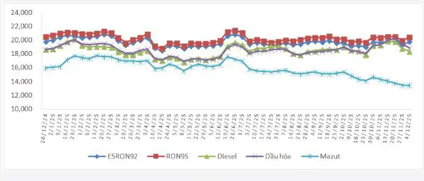 Thị trường xăng dầu thế giới kỳ điều hành lần này (từ ngày 27/11/2025 - 03/12/2025) chịu ảnh hưởng của các yếu tố chủ yếu như: OPEC+ quyết định giữ nguyên mức sản lượng khai thác dầu cho đến hết năm 2026; căng thẳng gia tăng giữa Mỹ và Venezuela; xung đột quân sự giữa Nga với Ucraina vẫn tiếp diễn; Mỹ và Nga không đạt được thỏa thuận chấm dứt xung đột tại Ucraina… Các yếu tố nêu trên khiến giá xăng dầu thế giới trong những ngày vừa qua có diễn biến tăng, giảm tùy từng mặt hàng.