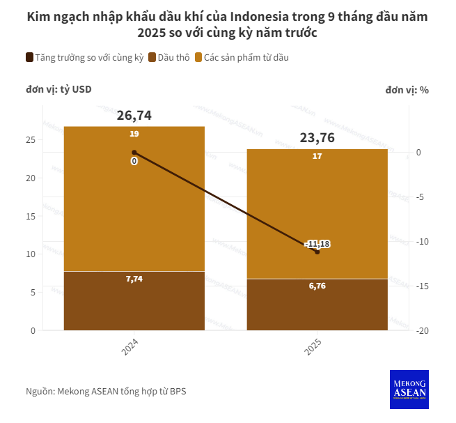 Theo số liệu do Cơ quan Thống kê Quốc gia Indonesia (BPS) công bố ngày 3/11, trong 9 tháng đầu năm 2025, Indonesia đã chi 23,76 tỷ USD cho nhập khẩu dầu khí, giảm 11,18% so với cùng kỳ năm 2024 (YoY).
