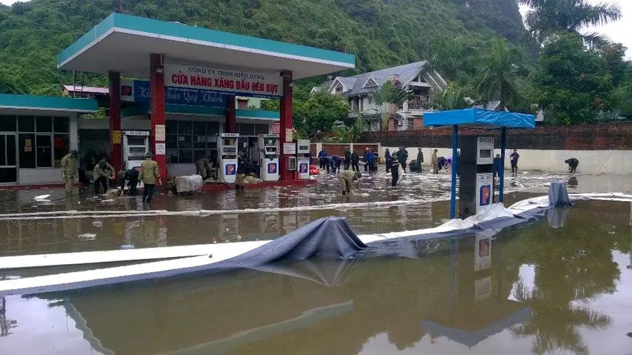 Vào sáng ngày 29/7, cây xăng Đèo Bụt của Công ty TNHH Hiền Dung đã bất ngờ bị nước lũ nhấn chìm và làm các téc xăng dầu bị vỡ van khiến lượng lớn xăng dầu tràn ra ngoài theo dòng nước.