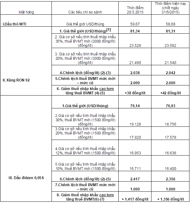 Trường hợp giá xăng dầu thế giới không có biến động lớn, với thuế BVMT theo mức mới áp dụng từ ngày 1/5/2015 và thuế nhập khẩu theo các phương án điều hành nói trên thì giá xăng dầu trong nước còn có thể giảm, đặc biệt đối với giá dầu điêzen. Tuy nhiên, do giá xăng dầu thế giới tăng trở lại nên việc giảm thuế nhập khẩu đã làm giảm áp lực tăng giá đối với các mặt hàng này.