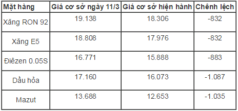 Theo tính toán của Bộ Công Thương, giá cơ sở xăng dầu giảm 832-1.087 đồng một lít (kg) so với kỳ điều chỉnh giá gần nhất (ngày 11/3), do diễn biến thế giới đi xuống. Giá cơ sở là căn cứ để các doanh nghiệp đầu mối ấn định mức bán lẻ trong hệ thống của mình. Trong giá cơ sở đã bao gồm giá nhập khẩu về cảng, quy đổi theo tỷ giá ngân hàng, thuế các loại, chi phí kinh doanh và lợi nhuận định mức.
