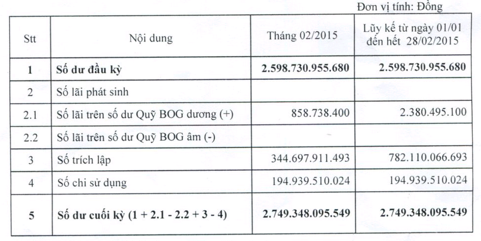 Số lãi trên số dư Quỹ tháng 2/2015 là 857.738.400 đồng, lũy kế từ đầu năm đến hết 28/2 là 2.380.495.100 đồng.