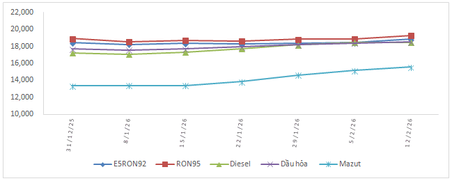 Biến động giá bán xăng dầu trong nước năm 2026 (31/12/2025 đến 12/02/2026)