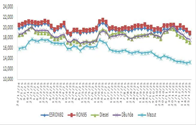 Thị trường xăng dầu thế giới kỳ điều hành lần này (từ ngày 18/12/2025 - 24/12/2025) chịu ảnh hưởng của các yếu tố chủ yếu như: triển vọng thỏa thuận hòa bình giữa Nga và Ucraina; căng thẳng trong mối quan hệ giữa Mỹ và Venezuela, Mỹ ngăn chặn tàu chở dầu của Venezuela; xung đột quân sự giữa Nga với Ucraina vẫn tiếp diễn, hai bên tiếp tục tấn công nhằm vào cơ sở hạ tầng năng lượng của nhau… Các yếu tố nêu trên khiến giá xăng dầu thế giới trong những ngày vừa qua có diễn biến tăng, giảm tùy từng mặt hàng.