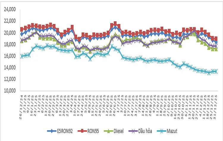 Thị trường xăng dầu thế giới kỳ điều hành lần này (từ ngày 25/12/2025 - 30/12/2025) chịu ảnh hưởng của các yếu tố chủ yếu như: tình hình bất ổn mới tại khu vực Trung Đông; tiến triển của thỏa thuận hòa bình giữa Nga và Ucraina; Trung Quốc gia tăng nhập khẩu dầu thô; căng thẳng trong mối quan hệ giữa Mỹ và Venezuela; xung đột quân sự giữa Nga với Ucraina vẫn tiếp diễn… Các yếu tố nêu trên khiến giá xăng dầu thế giới trong những ngày vừa qua có diễn biến tăng, giảm tùy từng mặt hàng.
