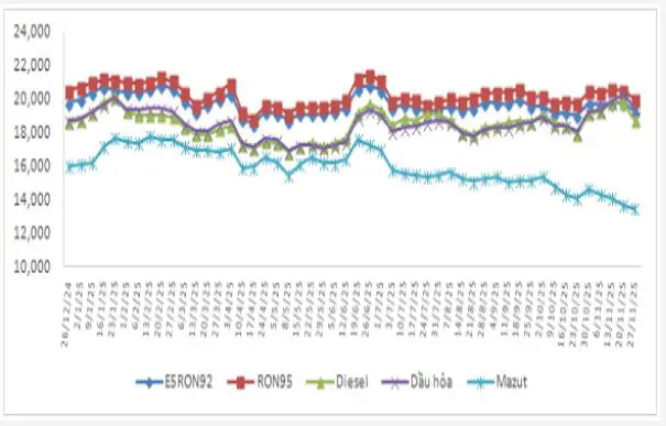 Thị trường xăng dầu thế giới kỳ điều hành lần này (từ ngày 20/11/2025 - 26/11/2025) chịu ảnh hưởng của các yếu tố chủ yếu như: đề xuất mới của Mỹ nhằm chấm dứt xung đột quân sự giữa Nga và Ucraina; tồn kho dầu thô của Mỹ giảm, trong khi tồn kho xăng và dầu diesel tăng; xung đột quân sự giữa Nga với Ucraina vẫn tiếp diễn… Các yếu tố nêu trên khiến giá xăng dầu thế giới trong những ngày vừa qua có diễn biến tăng, giảm tùy từng mặt hàng nhưng xu hướng chung là giảm.