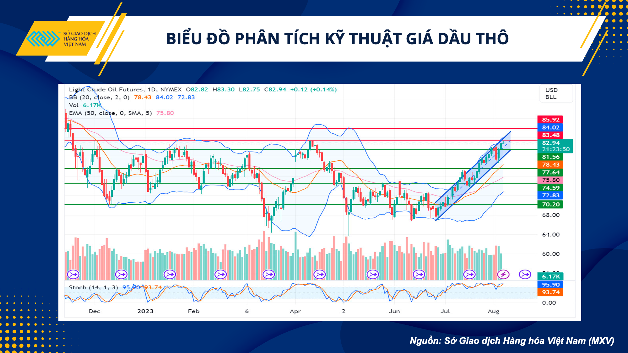 Giá dầu có xu hướng rút chân lại sau khi chạm cạnh trên của kênh xu hướng, và vùng kháng cự 83,5 USD. Đây là vùng kháng cự cứng, giá dầu chưa vượt được qua vùng này kể từ giữa tháng 11/2022, tương đương gần 9 tháng.