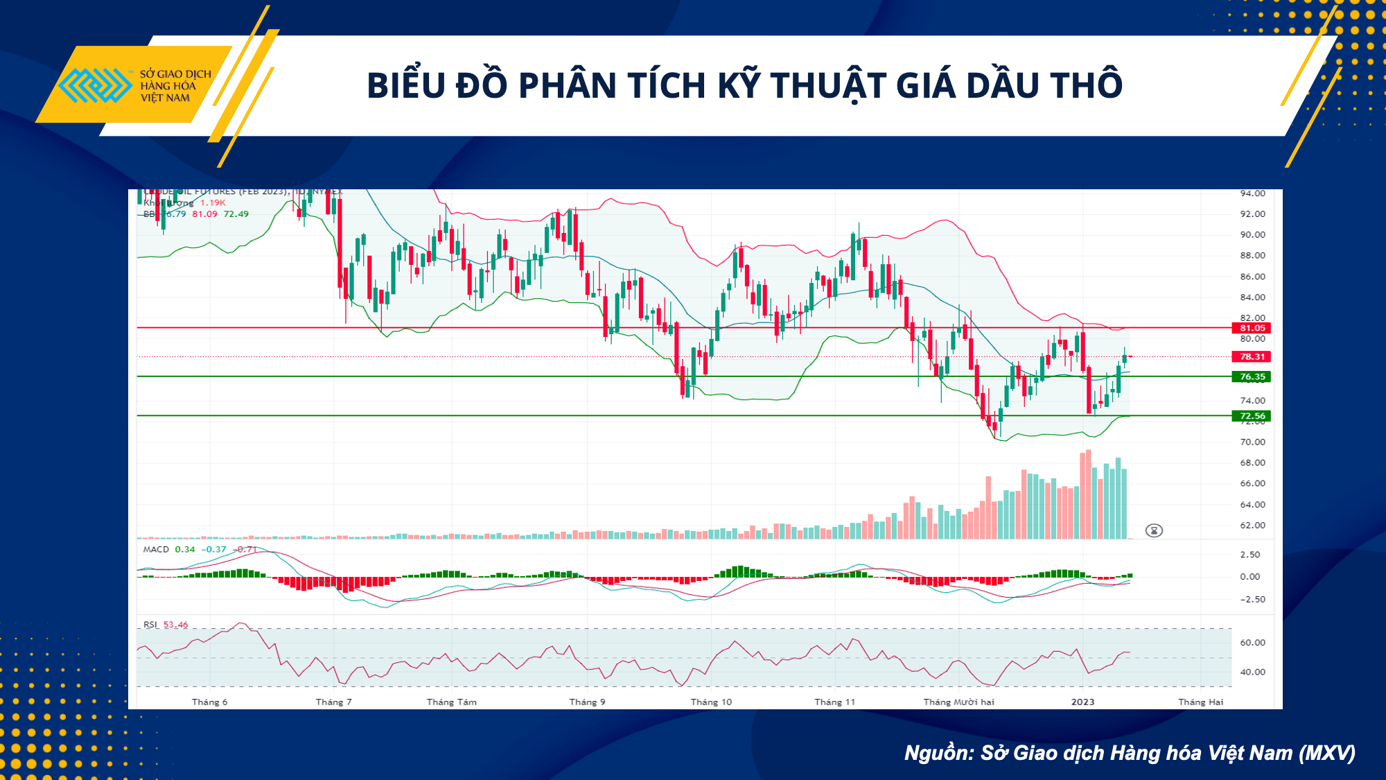 Lăng kính kỹ thuật cho thấy giá đang dao động ở nửa trên của Bollinger Band với các chỉ số MACD và RSI đều hướng lên tích cực. Nhà đầu tư có thể mở vị thế mua ở mức 78,2 USD với kỳ vọng chốt lời ở mức 79,5 USD.