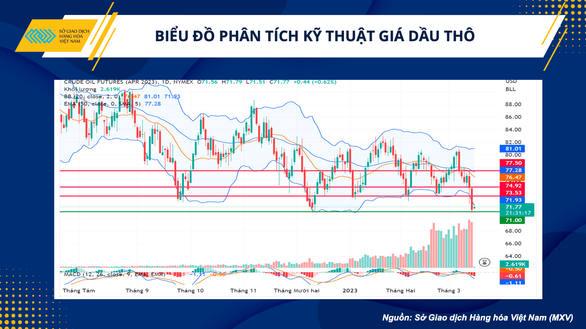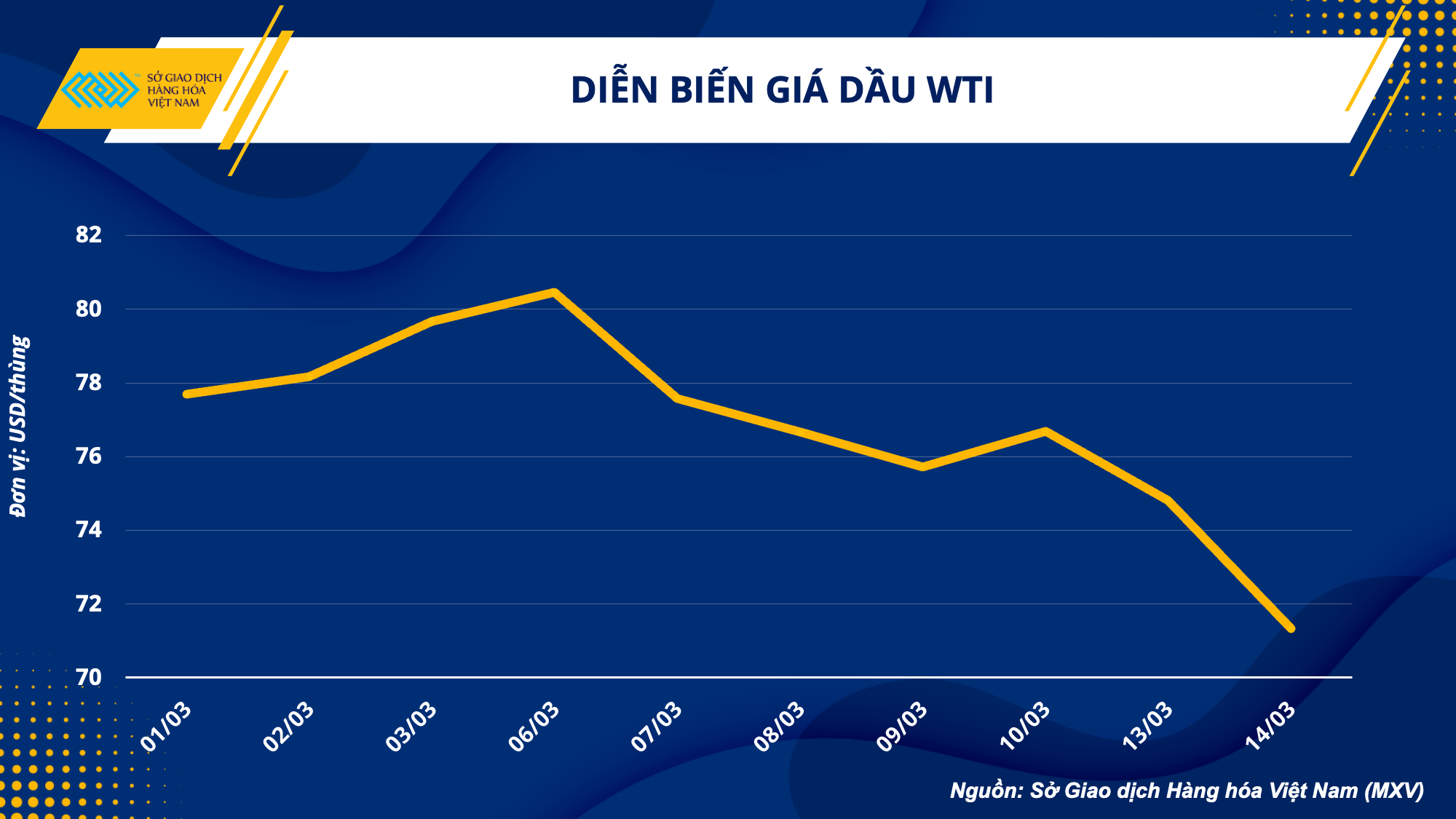 Kết thúc phiên giao dịch ngày 14/03, thị trường năng lượng chứng kiến phiên lao dốc mạnh mẽ của cả 2 loại mặt hàng dầu thô WTI và Brent với mức giảm lần lượt là 4.64% xuống 71,33 USD/thùng và 4,11% xuống 77,45 USD/thùng. Lo ngại về lạm phát cố hữu buộc chính sách thắt chặt tiền tệ vẫn sẽ tiếp tục được thực hiện, trong bối cảnh rủi ro tài chính kinh tế gia tăng đã kéo giá dầu ghi nhận phiên giảm trong ngày mạnh nhất kể từ ngày 4/1 hồi đầu năm, đẩy giá dầu đóng cửa mức thấp nhất trong vòng hơn 3 tháng.