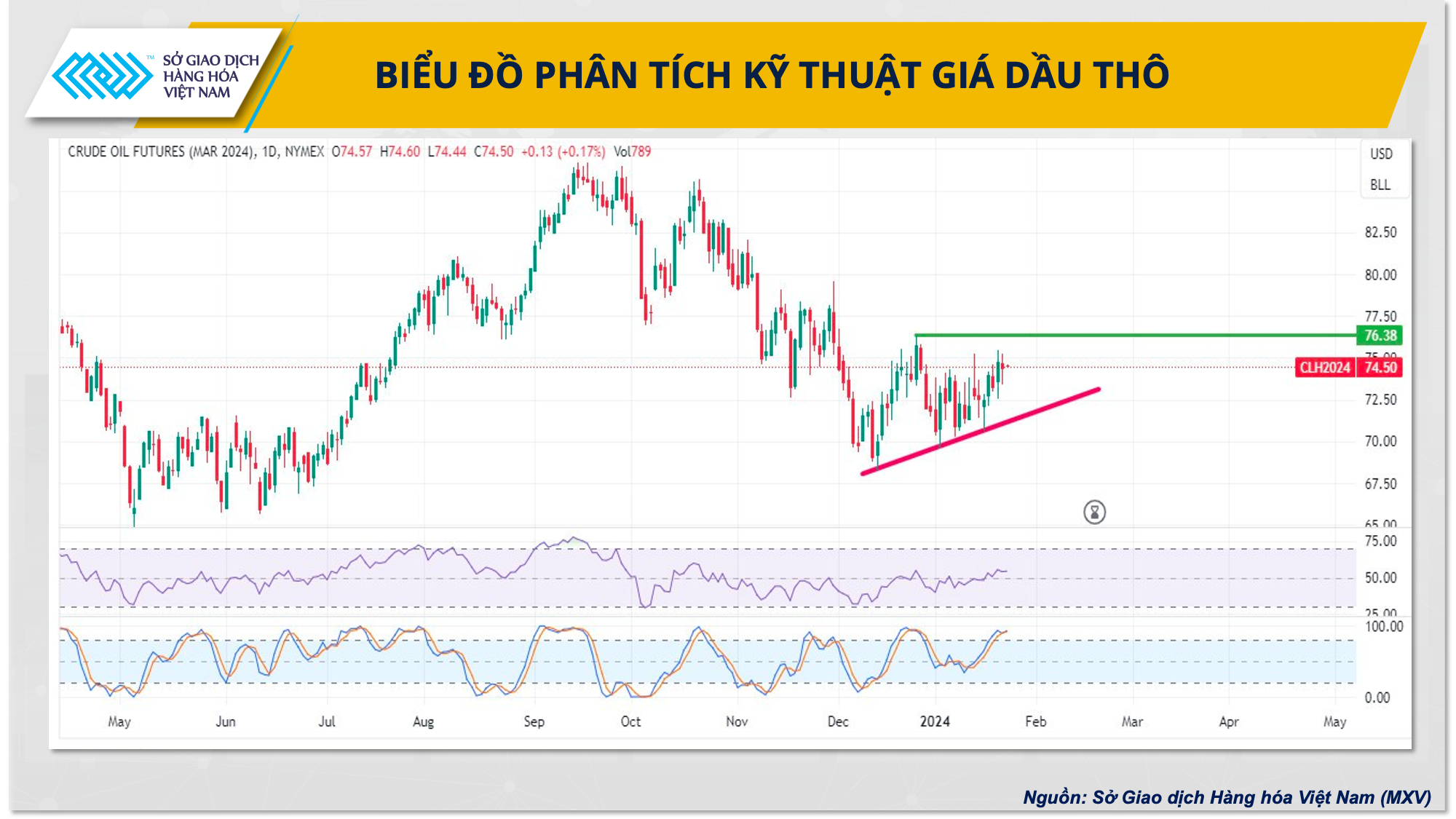 Diễn biến giá tương đối giằng co khi phiên trước đóng nến spinning top, phản ánh sự cân bằng giữa lực mua và lực bán. Trong khi đó, Stoch RSI đã đi vào vùng quá mua và hai đường %D, %K co hẹp lại và có dấu hiệu cắt xuống. Tuy nhiên, trên khung 4H, giá giằng co đi ngang trong biên độ 74 - 74,5 USD. Khung 1H xuất hiện nến doji, theo sau là một nến giảm, có thể xác nhận tín hiệu đảo chiều giảm ngắn hạn của giá. Dự báo giá dầu có thể điều chỉnh giảm về vùng hỗ trợ 73,2 - 73,5 USD. Biên độ dao động của giá khá hẹp, nhà đầu tư nên chờ thêm tín hiệu kỹ thuật bứt phá từ giá.