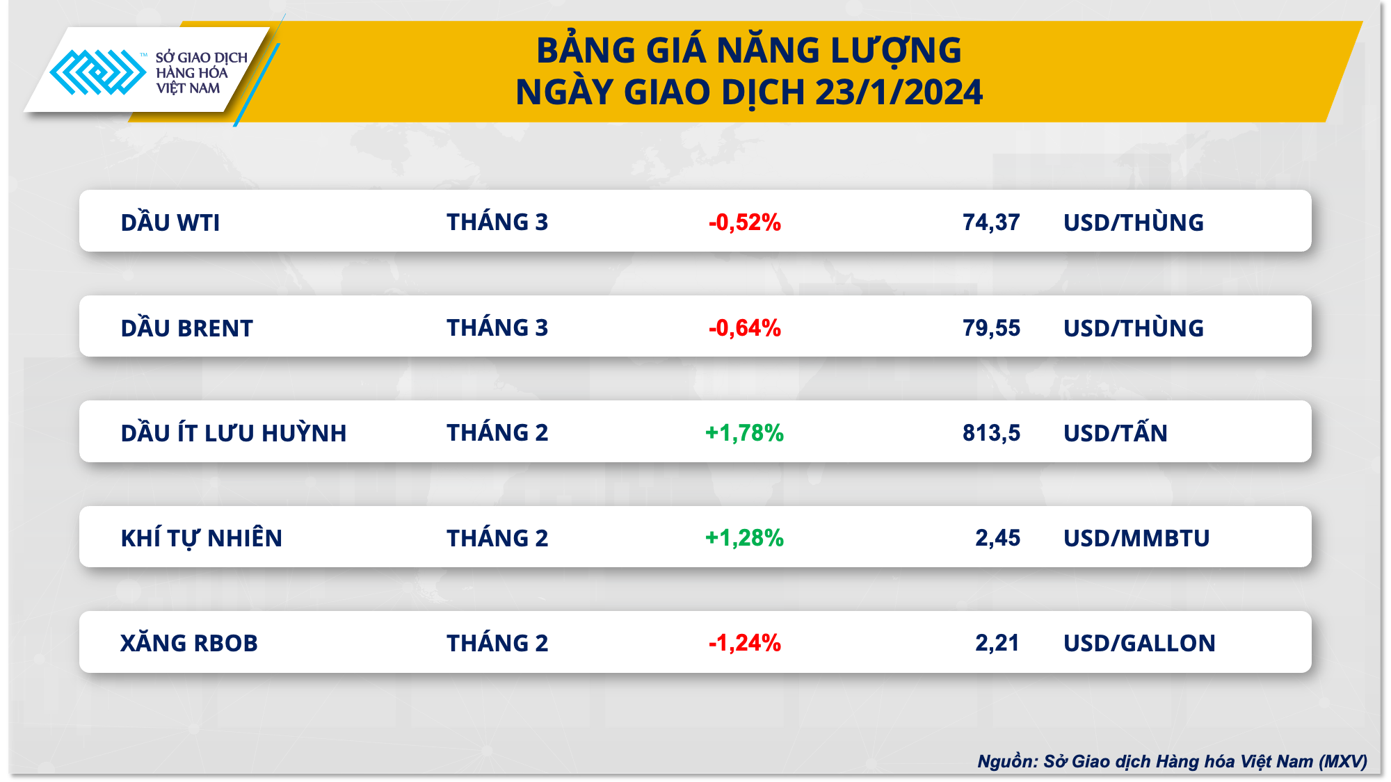 Chốt phiên, giá dầu WTI giảm 0,52% xuống 74,37 USD/thùng. Dầu Brent giảm 0,64% xuống 79,55 USD/thùng.