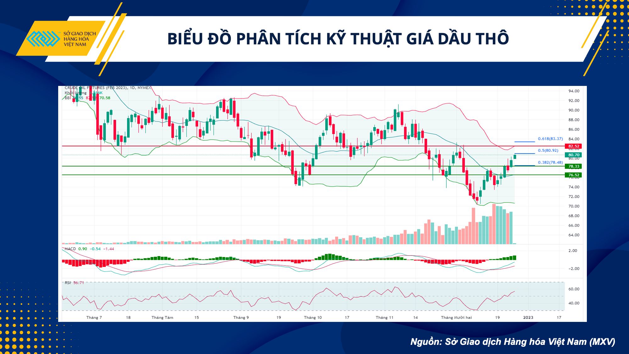 Về mặt kỹ thuật, giá dầu bật tăng ngay từ sáng nay với các chỉ số MACD và RSI đều hướng lên rất mạnh mẽ. Giá có thể sớm kiểm nghiệm lại vùng kháng cự 81 USD (Fibonacci 50.0) và có thể tiến lên vùng cạnh trên của Bollinger Band và Fibonacci 61,8, tương đương khu vực 82,5 - 83 USD. Nhà đầu tư nên mở vị thế mua vào phiên hôm nay, và cân nhắc vào từ mức giá 80,5 USD với kỳ vọng chốt lời ở mức 81,8 USD.