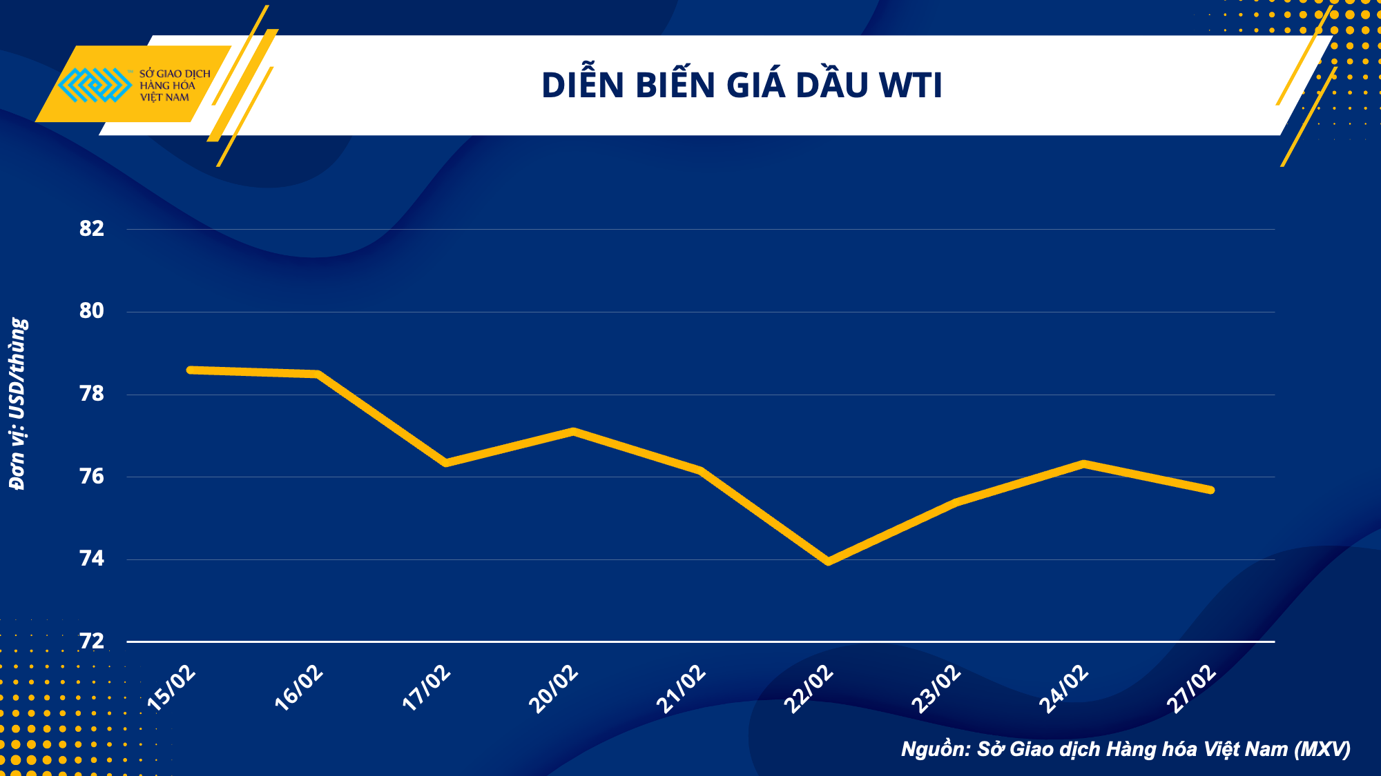 Kết thúc phiên 27/02, giá dầu thô WTI giảm 0,84% về 75,68 USD/thùng, giá dầu thô Brent giảm 0,92% về 82,06 USD/thùng.