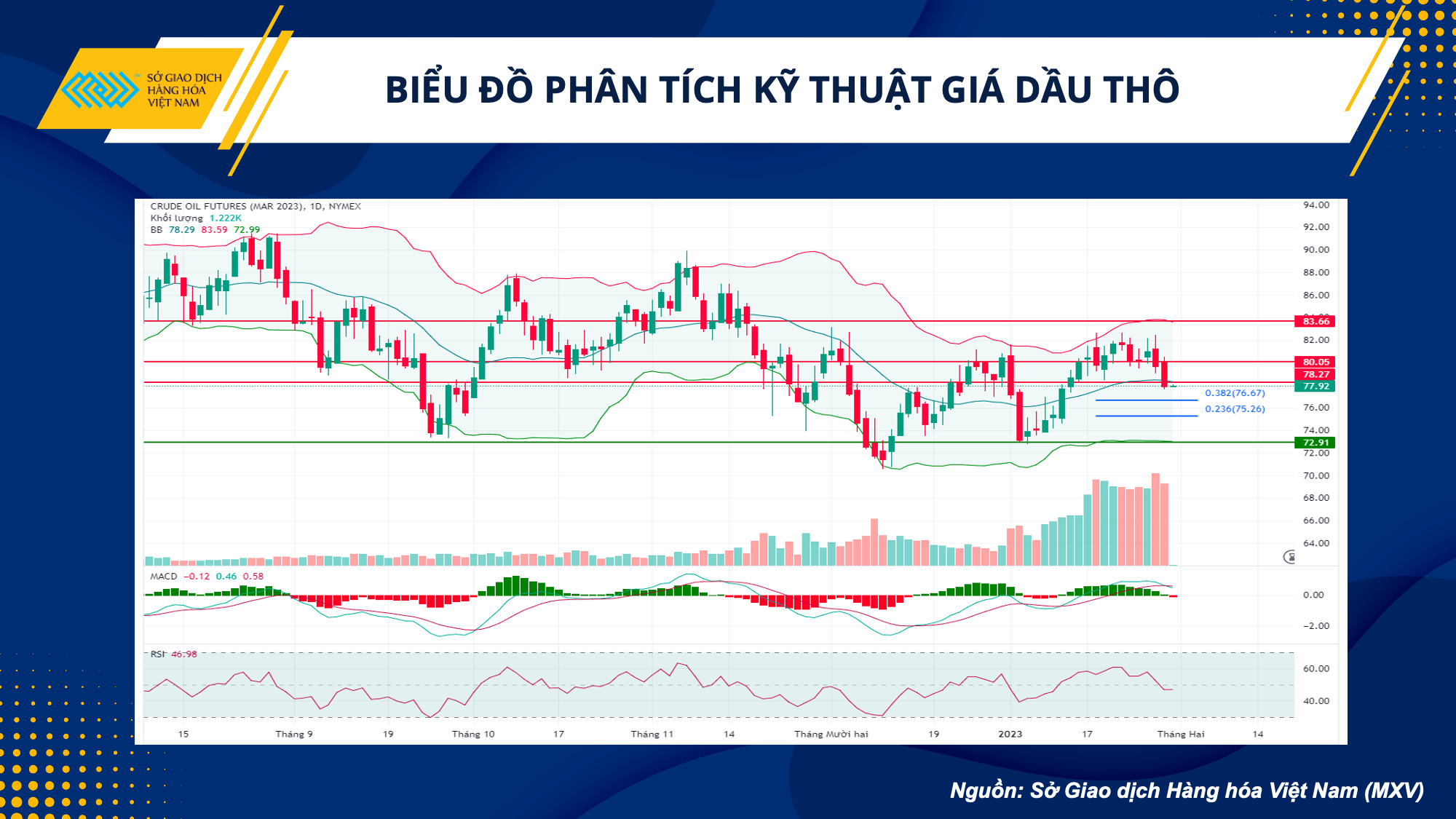 Lăng kính kỹ thuật cho thấy các tín hiệu tương đối tiêu cực với thị trường dầu, khi mà giá đã đóng cửa dưới cạnh giữa của Bollinger Band. Các chỉ số MACD và RSI đều hướng xuống, cho thấy xác suất giá giảm đang cao hơn. Nhà đầu tư có thể mở vị thế bán từ mức 78 USD với kỳ vọng chốt lời ở mức 77,8 USD, nếu các số liệu PMI được công bố tiêu cực.