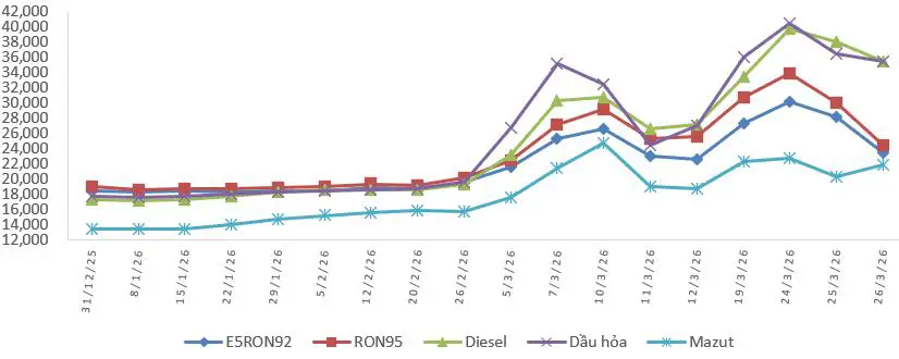 Trước diễn biến của giá xăng dầu thế giới, biến động tỷ giá VND/USD, căn cứ Nghị quyết số 36/NQ-CP ngày 06/3/2026 của Chính phủ về Phiên họp Chính phủ thường kỳ tháng 02 năm 2026, Nghị quyết số 55/NQ-CP ngày 19/3/2026 của Chính phủ sửa đổi, bổ sung một số nội dung tại Nghị quyết số 36/NQ-CP ngày 06/3/2026 của Chính phủ về Phiên họp Chính phủ thường kỳ tháng 02 năm 2026, thực hiện chỉ đạo của Thủ tướng Chính phủ tại Quyết định số 482/QĐ-TTg ngày 26/3/2026, Văn bản số 2058/VPCP-KTTH ngày 10/3/2026 của Văn phòng Chính phủ về chủ trương bình ổn giá xăng dầu, chỉ đạo của Lãnh đạo Chính phủ tại Văn bản số 2113/VPCP-KTTH ngày 11/3/2026 của Văn phòng Chính phủ về điều hành giá xăng dầu, tại Văn bản số 2406/VPCP-KTTH ngày 19/3/2026 của Văn phòng Chính phủ về đề nghị của Bộ Công Thương tại báo cáo số 1773/BC-BCT, liên Bộ Công Thương - Tài chính đã quyết định phương án điều hành giá xăng dầu bảo đảm hài hòa lợi ích giữa các chủ thể tham gia thị trường.