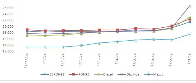 Thị trường xăng dầu thế giới kỳ điều hành lần này (từ ngày 26/02/2026 - 04/3/2026) chịu ảnh hưởng của các yếu tố chủ yếu như: xung đột quân sự giữa Mỹ, Israel với Iran diễn ra ngày 28/02/2026 và tiếp tục leo thang, dẫn tới tắc nghẽn việc vận chuyển dầu qua eo biển Hormuz, tuyến hàng hải vận chuyển khoảng 20% sản lượng dầu toàn cầu; Iran tấn công trả đũa vào các cơ sở quân sự của Israel, của Mỹ tại khu vực Trung Đông khiến hoạt động lọc dầu tại một số quốc gia tại khu vực Trung Đông buộc phải đóng cửa để tránh rủi ro, làm gia tăng lo ngại gián đoạn nguồn cung xăng dầu kéo dài; tồn kho dầu thô của Mỹ tăng; OPEC+ nhất trí tăng thêm sản lượng khai thác dầu từ tháng 4; xung đột quân sự giữa Nga với Ucraina vẫn tiếp diễn…