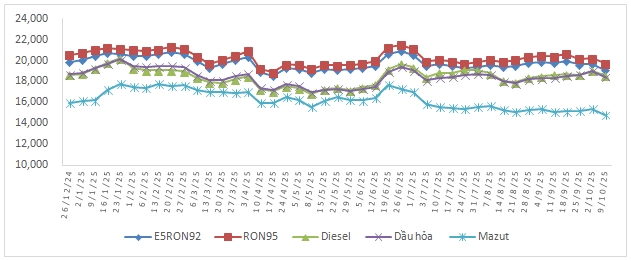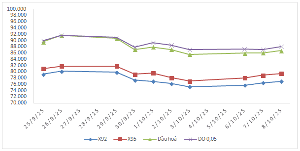 Bình quân giá thành phẩm xăng dầu thế giới giữa kỳ điều hành giá ngày 02/10/2025 và kỳ điều hành ngày 09/10/2025 là: 76,138 USD/thùng xăng RON92 dùng để pha chế xăng E5RON92 (giảm 2,578 USD/thùng, tương đương giảm 3,28%); 78,322 USD/thùng xăng RON95 (giảm 2,366 USD/thùng, tương đương giảm 2,93%); 86,298 USD/thùng dầu hỏa (giảm 3,088 USD/thùng, tương đương giảm 3,45%); 87,660 USD/thùng dầu điêzen 0,05S (giảm 2,308 USD/thùng, tương đương giảm 2,57%); 392,696 USD/tấn dầu mazut 180CST 3,5S (giảm 19,100 USD/tấn, tương đương giảm 4,64%).