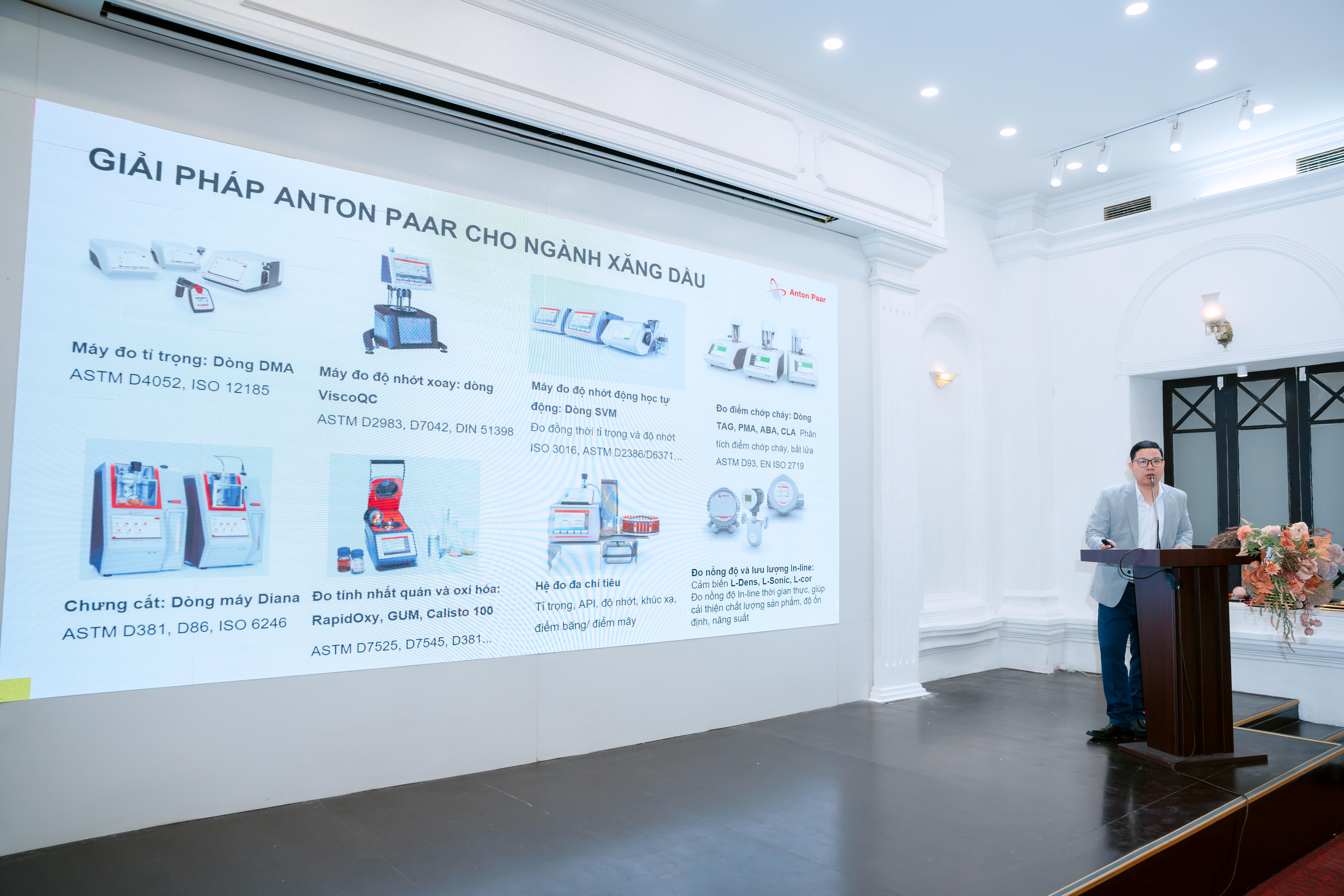 Công ty Anton Paar là đơn vị có lịch sử lâu đời trong việc cung cấp các thiết bị phòng thí nghiệm cao cấp: máy đo tỷ trọng, khúc xạ kế, phân cực kế, thiết bị chuẩn bị và tổng hợp mẫu, máy đo độ nhớt, máy đo lưu biến và thiết bị phân tích đặc tính vật liệu. Công ty cũng cung cấp giải pháp đo bồn tự động cho kho và cửa hàng xăng dầu, thiết lập các cảnh báo về tràn bồn, mức nước cao,...