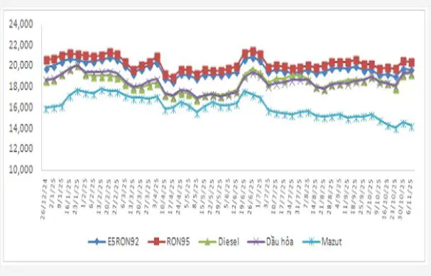 Thị trường xăng dầu thế giới kỳ điều hành lần này (từ ngày 30/10/2025 - 05/11/2025) chịu ảnh hưởng của các yếu tố chủ yếu như: Cục Dự trữ Liên bang Mỹ (Fed) cắt giảm lãi suất; đồng USD tăng giá; tồn kho dầu thô của Mỹ tăng, tồn kho xăng và sản phẩm chưng cất của Mỹ giảm; OPEC+ thống nhất tăng nhẹ sản lượng khai thác dầu trong tháng 12/2025 và tạm dừng việc tăng sản lượng khai thác dầu trong Quý I/2026; xung đột quân sự giữa Nga với Ucraina vẫn tiếp diễn… Các yếu tố nêu trên khiến giá xăng dầu thế giới trong những ngày vừa qua có diễn biến tăng, giảm tùy từng mặt hàng.